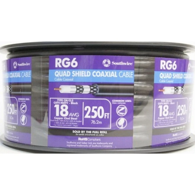 Be the first to review “250-ft 18 AWG RG6 Quad Shield Black Coax Cable Spool” Cancel reply