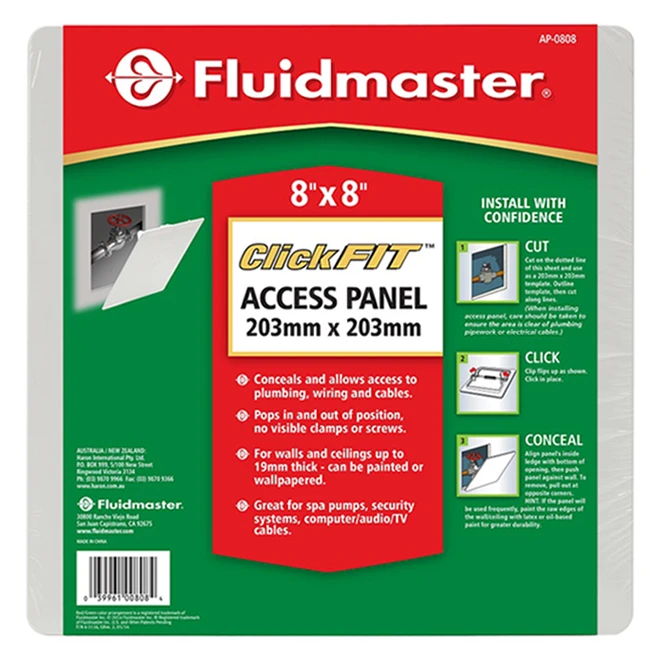 The Fluidmaster 8″ x 8″ white polystyrene access panel, 1″ thick, is ideal to cover up piping, electrical wiring and audio-visual cables. The panel does not require framing, is suited for up to 3/4″ thick walls and ceilings and has no visible clamps or screws.