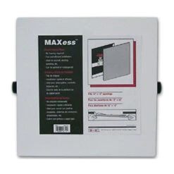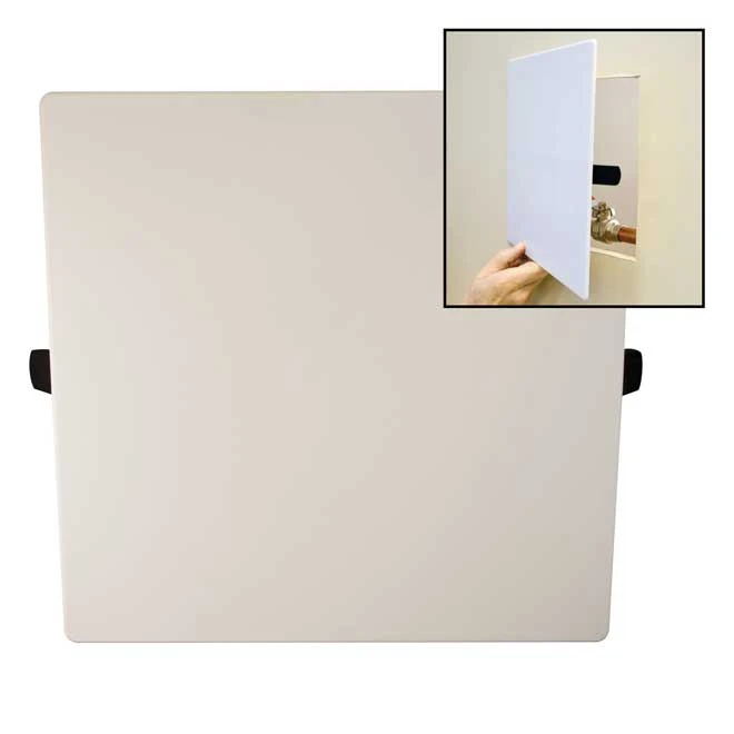 Access panel. 8 in. X 8 in. Made of plastic. Fast and efficient installation. The plywood free option, no framing or tools required. Provides fast access to plumbing and wiring behind pancling, drywall and ductwork. Paintable surface. White.