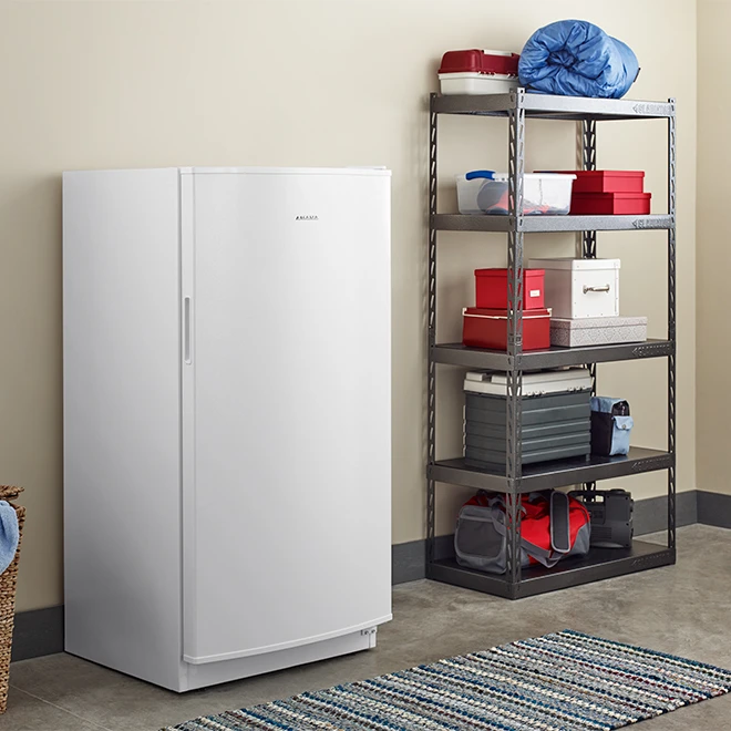 If you’re into the idea of buying food in bulk, you’ll love this 16 cu. ft. Amana upright freezer, which will let you store more frozen foods than ever before! It features a built-in option that helps you quickly freeze large amounts of food fast, by temporarily driving freezer temps 10 degrees colder than the lowest setting. DeepFreeze technology cools the freezer to -22°C so you can keep food frozen for months on end. The Free-O-Frost system helps prevent frost build-up, so you don’t have to worry about setting time aside to defrost your freezer. It’s backed by a one-year limited warranty on parts and labour.