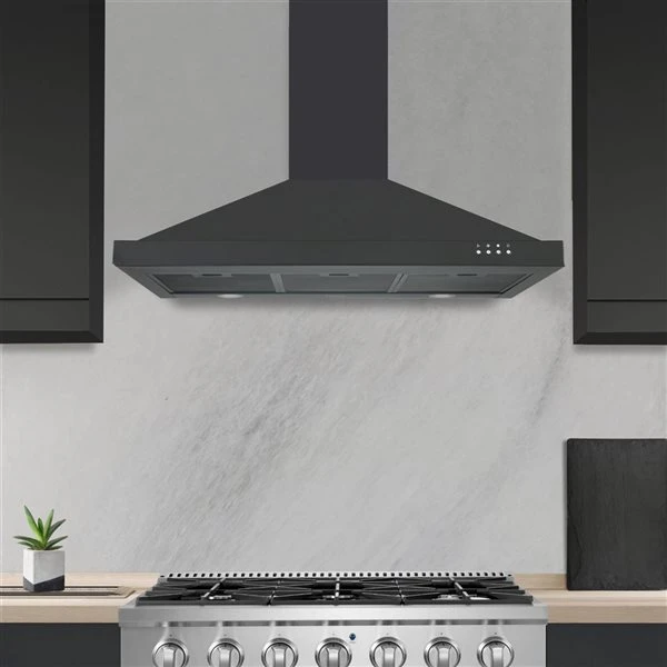 - 36-in wall mount pyramid range hood in black stainless steel