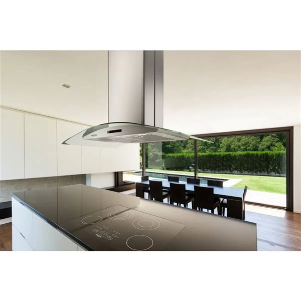 - 36-in wide island-mounted glass canopy shape