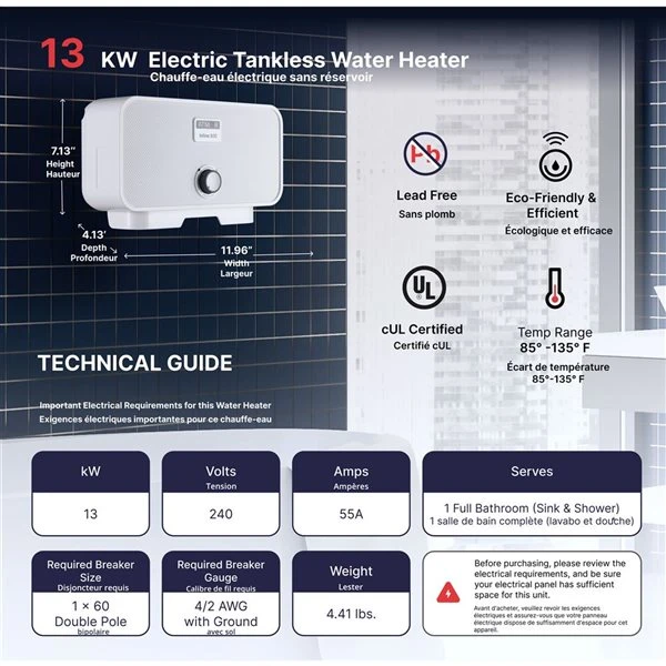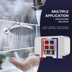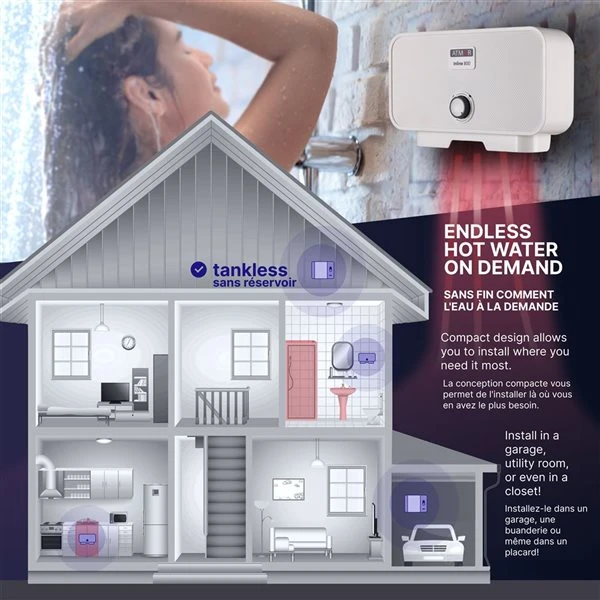 - Durable, point-of-use hot water solution ideal for a full bathroom nationwide – sink and shower combination