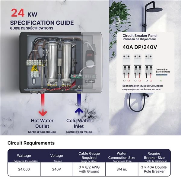 - Requires three 8 AWG wires, 240 V connection and three 40 A dedicated breakers, 1/2-in NPT (straight thread) fittings