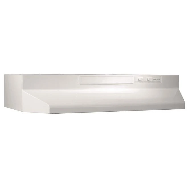 Get good quality air in your kitchen and dining areas with this white under cabinet range hood by Venmar. Part of the Broan’s BU2 series, it has a 2-speed blower that moves air at a rate of 210 CFM. It’s sound volume is equal to 6.5 sones. The blower channels the air through a standard efficiency aluminum filter to remove vapours, smoke and grease that emanate from the cooktop. Builders can install this convertible 30-in W white under cabinet range hood in a round, vertical, horizontal or non-ducted configuration. It works with a charcoal filter (not included) in a non-ducted design to trap grease and neutralize odours. The range hood seats a 75-W incandescent bulb (not included) for a direct, 1-level lighting to illuminate the cooktop. Available with a white finish, this modern under cabinet range hood complements a kitchen’s design with its contemporary style. It measures 17 1/2 in D x 6 in H. This Broan range hood comes with a 1-year limited warranty.