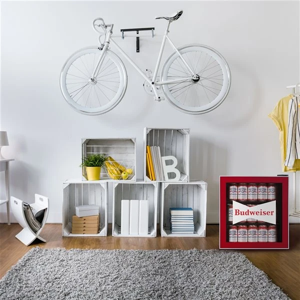 Perfect for your basement, home office or game room, this Budweiser beverage fridge holds up to 70 cans or 17 bottles. With a reversible glass door, keep all your drinks accessible and cold thanks to the thermostat with a cooling range of 4°C to 16°C.
