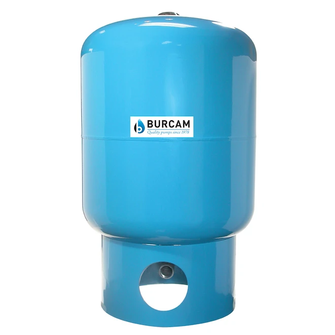 The Burcam 16 US gallons vertical captive air pressure tank is designed for residential water systems assembled with a jet pump or a deep well submersible pump. The tank has a tough, epoxy-baked steel finish and stainless steel flange with a 1″ NPT connection. The replaceable bladder is made of synthetic butyl rubber to increase reliability and life span. There is no water-to-metal contact for rust-free operation. The maximum working pressure is 100 PSI. The tank is factory pre-charged at 28 PSI. For use with a 20/40 PSI pressure switch, the air pressure in the empty tank must be adjusted to 18 PSI; for a 30/50 PSI switch, the pressure must be adjusted to 28 PSI. The drawdown is 5.0 US gal for a 20/40 PSI switch setting and 4.0 US gal for a 30/50 PSI switch setting.