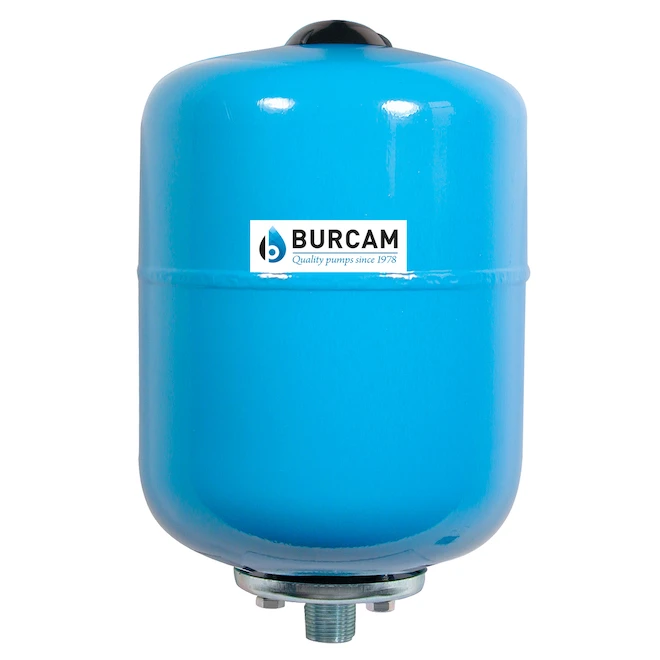 The Burcam 600542B 5 US gal (20L) inline captive air pressure tank is designed for water systems assembled with a jet pump. It has a tough epoxy-baked finish for durability and a replaceable bladder made of synthetic butyl rubber to increase reliability and life span. There is no water to metal contact for rust-free operation. The tank has a stainless-steel flange with a 1-inch NPT connection. It supports a 100 PSI maximum working pressure. For use with a 20/40 PSI pressure switch, the air pressure must be adjusted to 18 PSI; for a 30/50 PSI switch, the pressure must be adjusted to 28 PSI. Drawdown 1.6 US gal (20/40 PSI); 1.3 US gal (30/50 PSI).