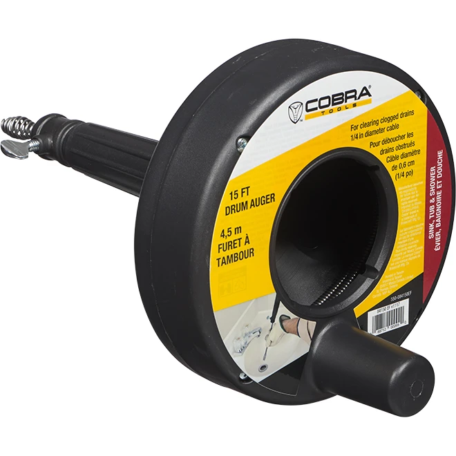 The Cobra Tools drain auger features reinforced cable thumbscrew providing a high impact resistance for durability. It clears pipes of 1 1/2″ diameter, quickly and effectively. The drain auger measures 1/4″ wide by 15′ long. This product is covered by a 1-year warranty.