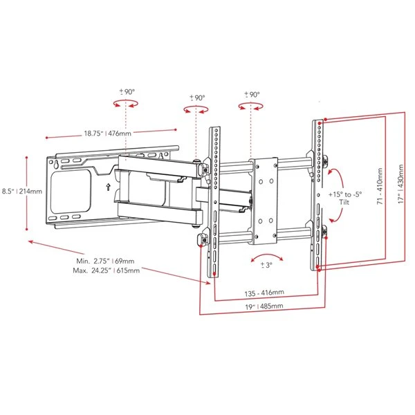- Full motion arm extends up to 24.25″ (61.5cm) from the wall