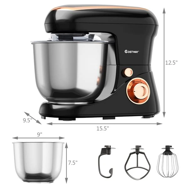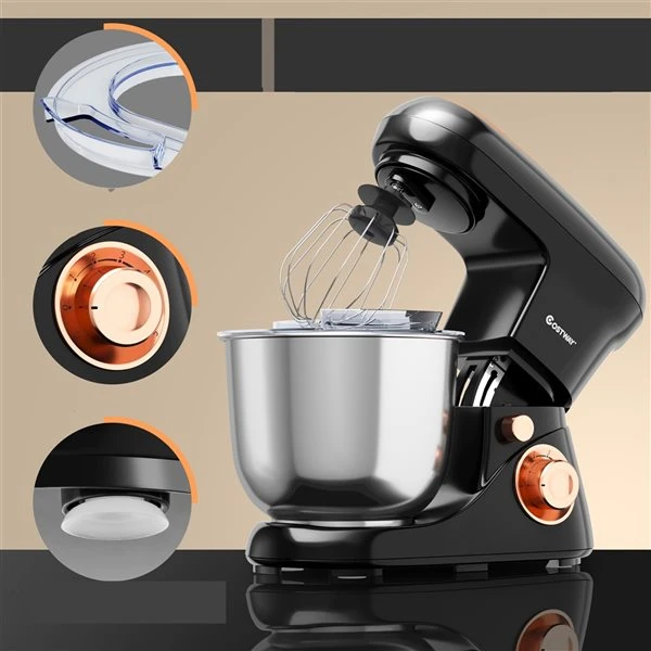 The stand mixer is designed for hands-free mixing for a variety of food. The stand mixer can perfectly deal with all kinds of ingredients ranging from cream and egg whites to heavy dough. Its power motor ensures a more efficient way to mix food, and the 6 different speeds can meet all your kitchen needs. On the bottom, 4 non-slip pads help to keep the stand mixer stable and steady while working. The stainless steel bowl is equipped with a splash guard to keep the kitchen clean.