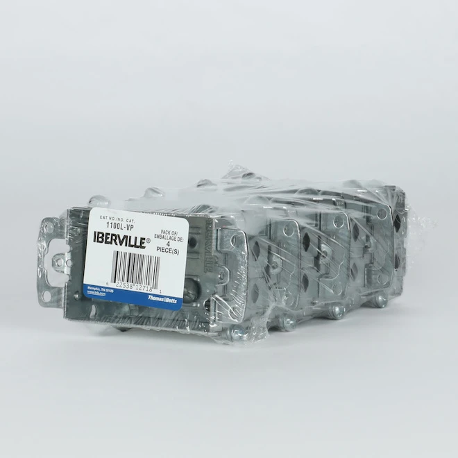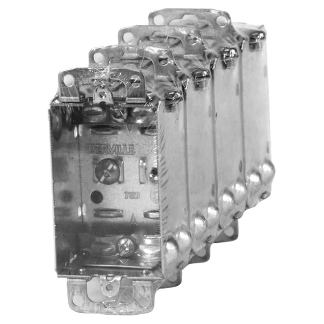 Install switches or receptacles in a recessed wall with these Iberville device boxes. The device boxes have flush-mount ears for easy installation and include cable clamps. Made of galvanized steel, the device boxes are 1 1/2″ deep and have an 8 cubic inch capacity. The rectangular device boxes are gangable so you can easily join more than one box together. The pack conveniently includes 4 device boxes.