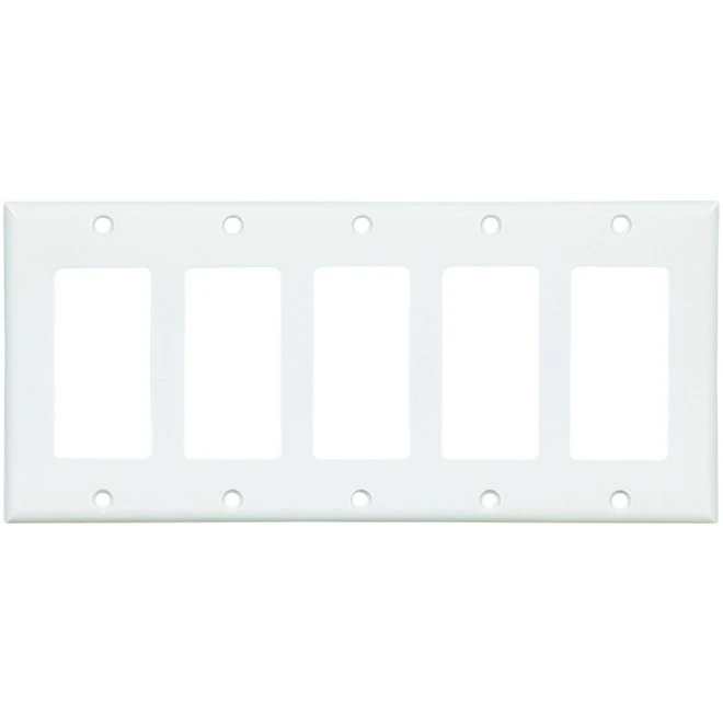 This 5-gang standard wall plate is made of plastic with smooth soil-resistant finish. The matching mounting screws are provided.