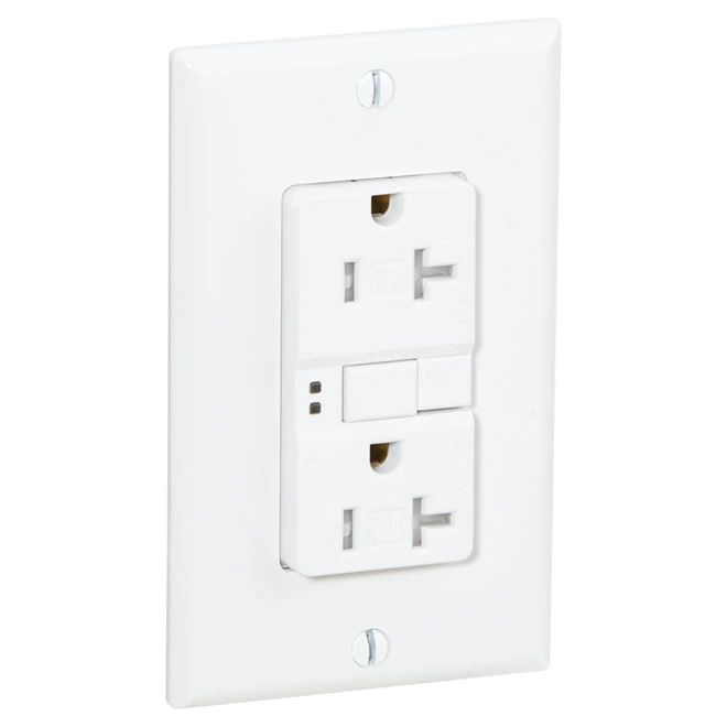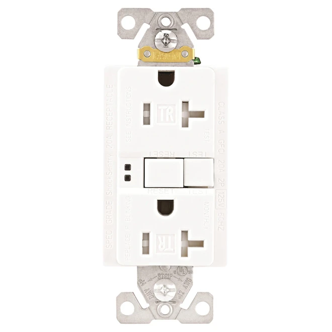 - White finish TR GFCI receptacle offers a 20-amp, 125-volt capacity for long-term indoor use