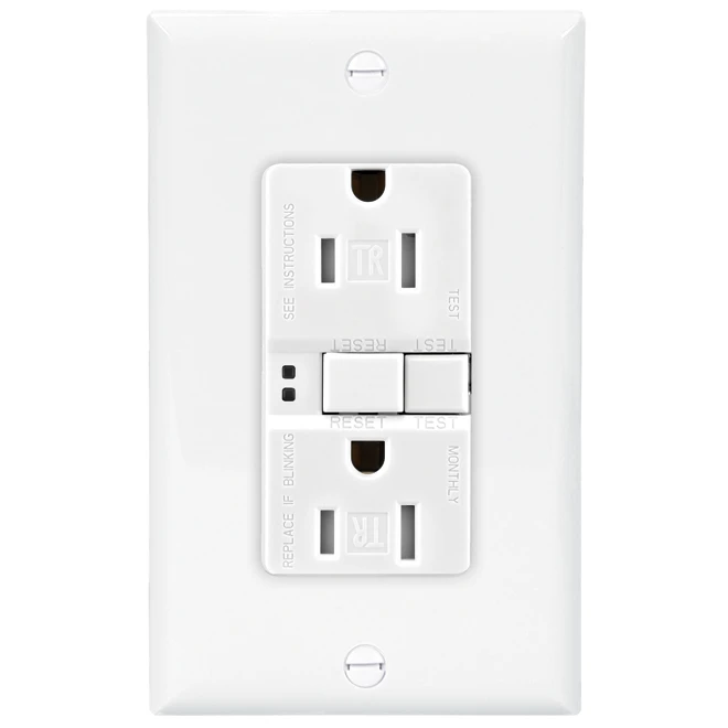 - White finish TR GFCI receptacle offers a 15-amp, 125-volt capacity for long-term indoor use