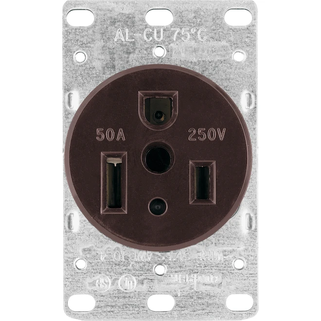 This Eaton receptacle is designed for use with copper or aluminum wire. The heavy gauge galvanized steel mounting strap provides excellent corrosion resistance. Voltage rating is NEMA 6-50R 250 volts.