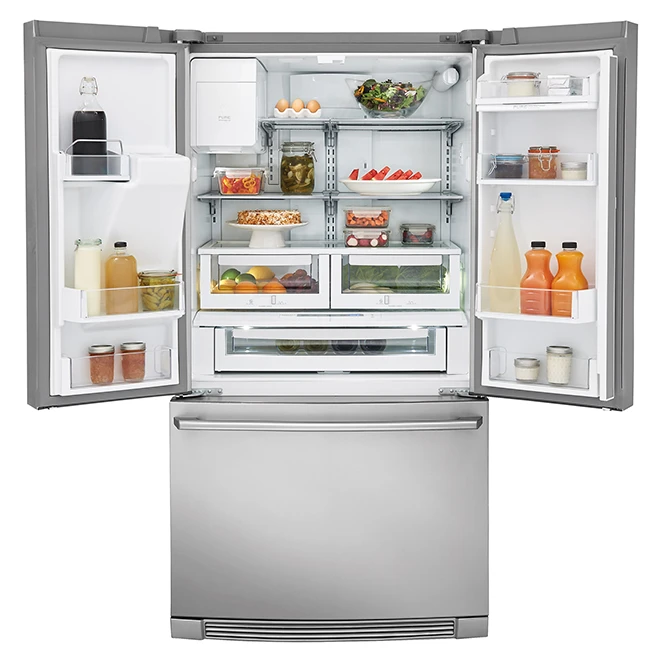 The Electrolux counter-depth French door refrigerator has a sleek recessed design while its self-closing doors provide peace of mind. This fridge has a Perfect Temp drawer with an electronic control allowing you to maintain certain foods at a personalized temperature with preprogramed options. It also has 2 crisper drawers to maintain optimal freshness. Luxury-Design LED lighting and glass shelves, touch-sensitive Wave-Touch controls and Luxury-Glide fully stretching soft drawers inspire elegance while not neglecting any functional aspect. As for the freezer, it has a wire pizza slot, a self-closing drawer and 2 baskets. Furthermore, this fridge comes with a durable water and ice dispenser equipped with a 3M water filter for unparalleled freshness.