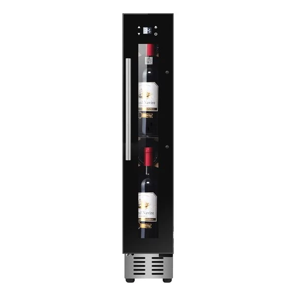 Transform the smallest of spaces into your very own sophisticated wine nook with the Equator super-slim 9-bottle wine refrigerator. Only 0.78-cu ft and measuring 32.28-in x 5.90-in x 20.66-in (H x W x D), harnessing the power of compressor fan cooling is right at your fingertips with sleek touchpad controls and a bright LED display. Your collection is always protected with a series of alarms to alert you of temperature fluctuations or when the door is left open. Plus, the anti UV glass blocks harmful rays from penetrating your prized collection. Expertly engineered with adjustable feet and a reversible door, this compact gem can be freestanding or placed under counters.