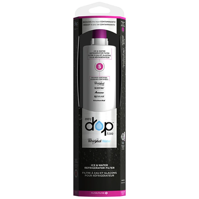 The Everydrop #5 refrigerator filter with advanced Triple Filtration technology further eliminates contaminants in running water based on NSF data, compared to published laboratory data for compatible filters. It thus reduces the presence of 23 contaminants, including pharmaceuticals, metals, minerals, pesticides, cysts, industrial chemicals, Class 1 particles and chlorine. Contaminants or other substances eliminated or reduced by this water filter are not necessarily found in the running water of all users. Replace the filter every 6 months to ensure clean and safe drinking water. This filter replaces previous models 4396508 and 4396510.