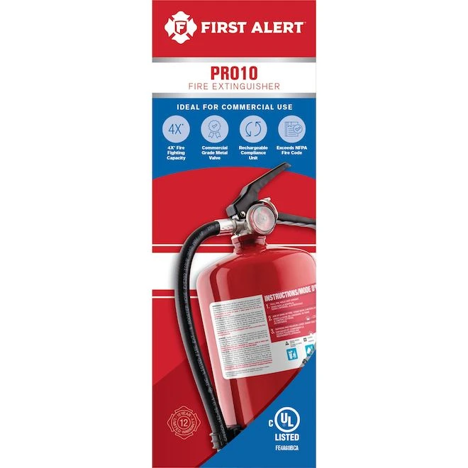 Cet extincteur commercial rechargeable de First Alert est idéal pour les besoins commerciaux importants. Ce grand extincteur à usage multiple combat les feux de liquides inflammables, d’électricité, de bois, de papier, de tissu et d’autres types de feux. La tête métallique durable est conçue pour répondre aux exigences d’une utilisation commerciale exigeante. S’il est déchargé, cet appareil peut être rechargé par un professionnel certifié. Comprend un crochet de fixation murale de qualité commerciale pour maintenir l’appareil en place. Le produit est couvert par une garantie limitée de 12 ans.