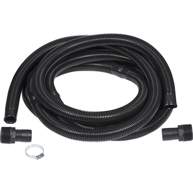 The Burcam(TM) flexible drainage hose kit is designed for a quick and easy sump pump discharge hose installation. Suitable for a sump pump with a 1 1/4″ or a 1/1/2″ discharge, it measures 20′ long. For less friction loss and increased pump performance, use a 1 1/2″ drain hose kit. The adaptors 1 1/4″ and 1 1/2″ are included.