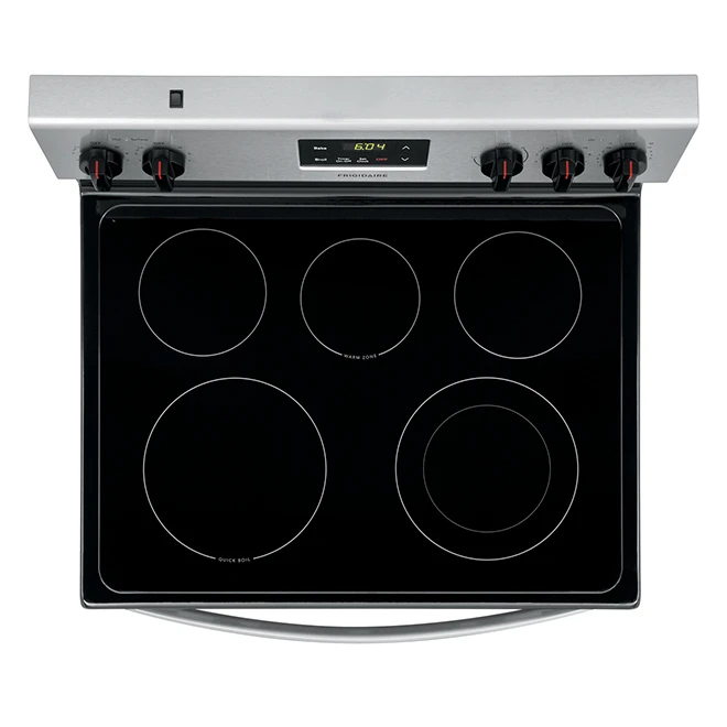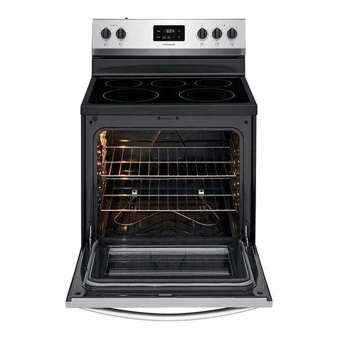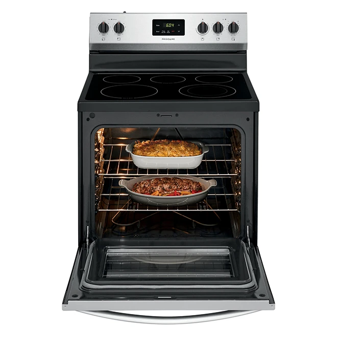Use this Frigidaire 5-element electric range oven to get a fresh experience of cooking and to ease the process. It offers a large capacity of 5.3 cu. ft. to give you a bigger room to cook more dishes at once. The ceramic glass cooktop has five elements, including the SpaceWise flexible element of 12 in which adjusts as per the cooking needs. This Frigidaire freestanding range oven is ideal for baking and broiling purposes as it emits even heat. Its large window door allows you to check on the status of food without opening it. It comes with a light which turns on to show hot surface, which ensures protection from any mishap. This range’s store-More storage drawer has ample space to hold various kitchen tools. The stainless steel exterior gives the oven a stylish look. It comes with a 1-year warranty against labour and parts.