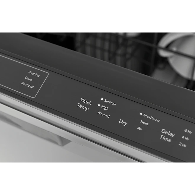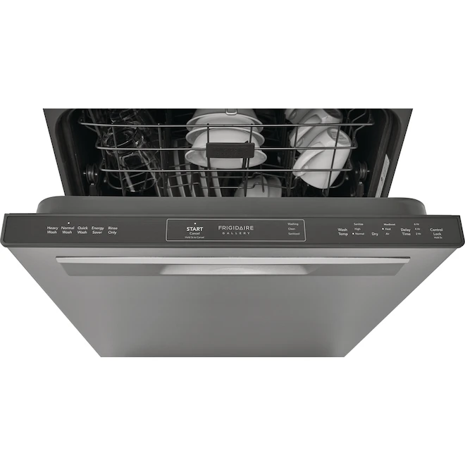 The Frigidaire Gallery 24-in built-in dishwasher offers a more complete clean with sensor technology that adjusts cleaning performance based on soil levels and the OrbitClean(R) Wash System with multi-directional spray patterns. Forget the hand towel with the MaxBoost(TM) Dry system. This quiet dishwasher (52 dBA) also offers a sanitize option, adjustable racks to fit more dish sizes, and LED floor indicator light, a 34 minute quick wash, and is Energy Star(R) certified.