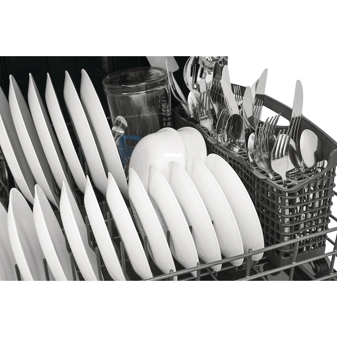 The Frigidaire Gallery 24-in Built-In Dishwasher offers a more complete clean with sensor technology that adjusts cleaning performance based on soil levels and the OrbitClean(R) Wash System with multi-directional spray patterns. Forget the hand towel with the MaxBoost(TM) Dry system. This quiet dishwasher (52 dBA) also offers a sanitize option, adjustable racks to fit more dish sizes, and LED floor indicator light, a 34 minute quick wash, and is Energy Star(R) certified.