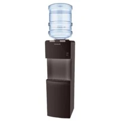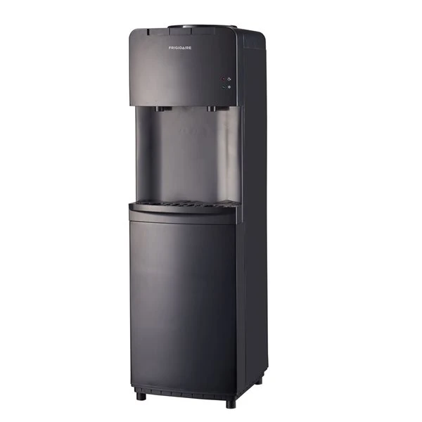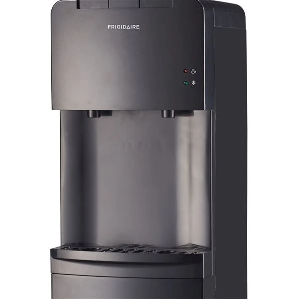 Make sure you drink enough water. This Frigidaire water cooler dispenses both cold and hot water. With 100Â W of cooling power and 420Â W of heating power, your water will always be at just the right temperature. Don’t rely on a thermoelectric cooled unit. This water cooler is powered by a robust compressor cooler, making sure your water is always nice and cold. This versatile Frigidaire cooler can hold 3 or 5 gallon bottles. With a clean white look, this water cooler would fit in any kitchen, office or dorm. There is also an indicator displaying the cooling, heating and power activity. A child safety lock on the hot water is included.
