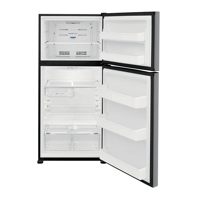 The Frigidaire top-freezer refrigerator features the EvenTemp cooling system, which continuously monitors internal temperature levels and delivers cold airflow to every corner, keeping the entire fridge at a low, even temperature. This fridge has a capacity of 18.3 cu ft, and its interior is cleverly divided to optimize usable space. This refrigerator features 2 humidity-controlled crisper drawers, a deli drawer, 3 full-width door bins large enough to contain big liquid containers, and 2 full-width shelves in the refrigerator, and another one in the freezer. Its self-closing doors help keep cold air inside the unit, while the stainless steel face has an EasyCare stain-resistant finish, providing an elegant look that’s easy to clean. The refrigerator meets superior performance standards and is backed by a 1-year limited warranty on parts and labour.