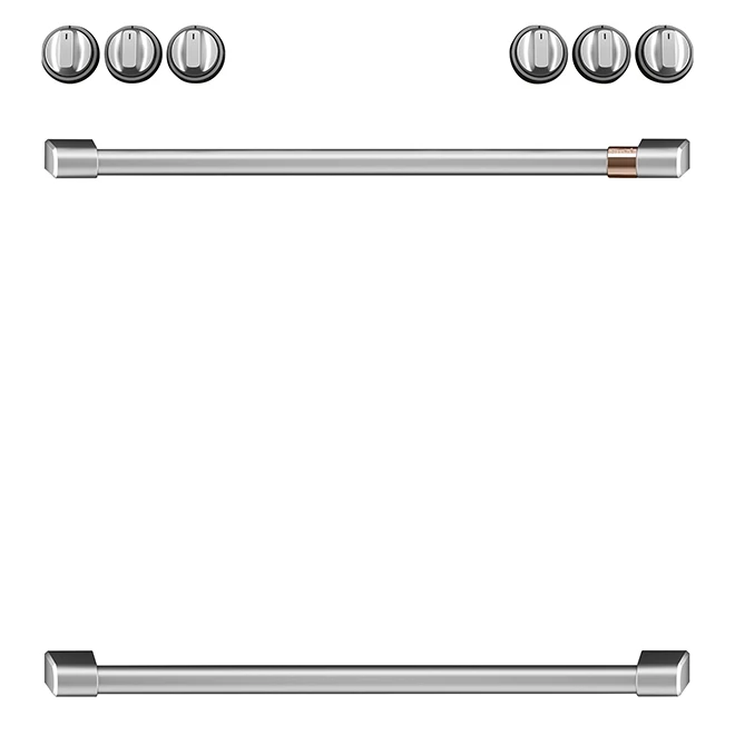Customized your electric range with this set of elegant and sleek brushed stainless control knobs and handles exclusively crafted for GE Café® range models; CCHS900P3MD1, CCHS950P3MD1 and CCHS950P4MW2. This product is backed by a 1-year limited warranty.