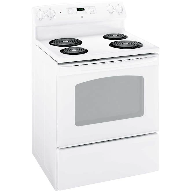 Get your meals ready while saving money with this GE 30-inch electric coil range. Offering efficient heating, it comes with the TrueTemp cooking system that helps maintain consistency of the oven’s temperature to provide optimal baking results. This product is backed by a 1-year limited warranty.
