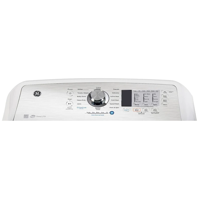 Tackle the tough stains and large loads with this top-loading GE high-efficiency and Energy Star-certified washer. This generously sized 5.2 cu. ft. washer features 14 wash cycles, Precise Fill automatic load sensing, and a SaniFresh cycle for cleaner clothes. The soft closing lid on this machine eliminates accidental slamming. Stainless steel tub resists rust and won’t chip for long-lasting durability, while preventing clothes from peeling or snagging. Speed wash cycle provides a quick cleaning process for smaller loads, and SaniFresh cycle uses a very high temperature water and a longer wash cycle to kill bacteria. Pump purge and extended rinse then removes remaining contaminants. Stain pretreat option helps eliminate tough stains such as tomato, wine, blood, grass and dirt with preprogrammed settings that modify your cycle. Deep rinse option ensures perfectly clean clothes by eliminating soap residue and fabric softener. Finally, My Cycle option lets you program your own cycle, simply press and hold for three seconds and your cycle will be saved.