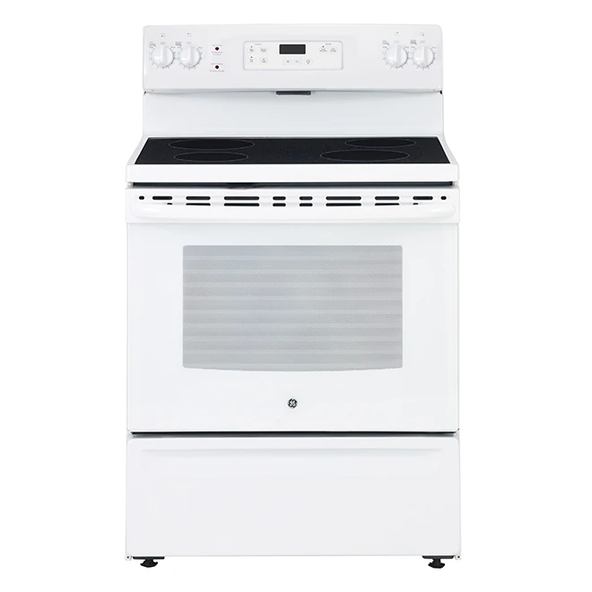Give your guests a memorable culinary experience with this GE freestanding range. This unit has a white finish, which contrasts well with the black cooktop, to bring a touch of sophistication to your space. The smooth cooktop has a ceramic construction which resists stains and chips for durability. Four cooking elements that range in size between 6-in and 8-in dia. let you prepare multi-step recipes fast. This stainless steel electric range stands up to daily cooking and grilling. It has a 5 cu. ft. oven for taking care of your baking and broiling needs. With two chrome oven racks and six positions, this single-oven electric range accommodates large baking pans. The appliance has an indicator which alerts you when the cooktop is hot for safety. A Sabbath mode function keeps your food warm. In the integrated bottom drawer, this appliance enables you to keep frequently used baking tools accessible. It has a 1-year limited warranty.