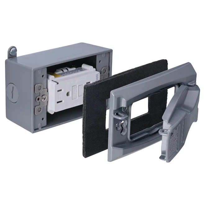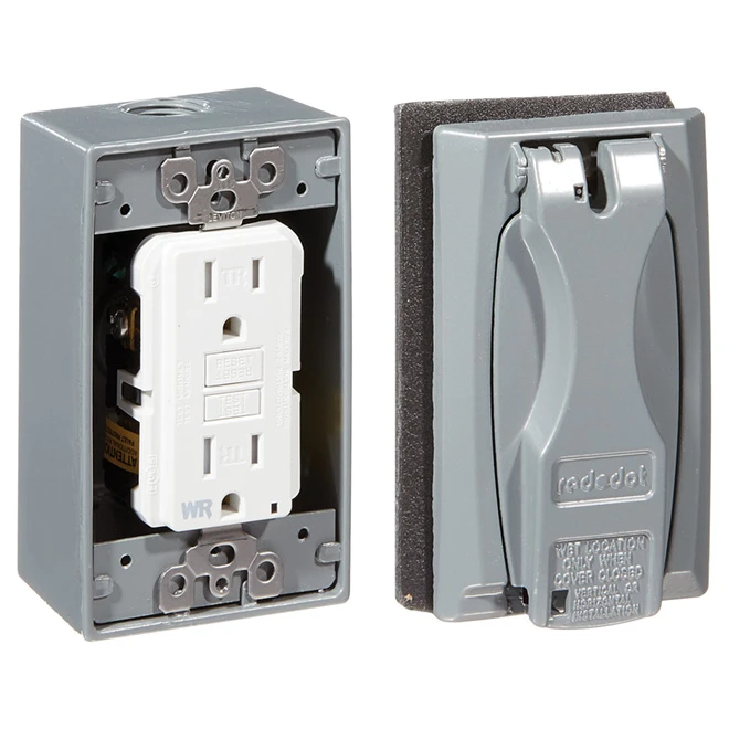The Red Dot(TM) outlet kit single gang Universal FGCI outlet box kit, aluminum, taper and weather resistant. The complete kit contains an outlet box, TR/WR self testing GDCI outlet, gasket, outlet cover, 2 plugs, all screws, mounting lugs and sealant.