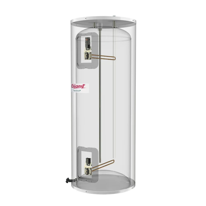 The Standard water heater by Giant® features a top water entry and is designed to meet your household hot water needs. It is equipped with a safety valve, and heat traps factory installed. The interior of the tank is coated with a blue cobalt glass enhanced with zircon, a feature unique to Giant®. This water heater is equipped with adjustable thermostats with automatic temperature control. Its high-quality magnesium anode offers an excellent protection against the corrosive effects of water. In addition, its GreenFoam® ecological foam insulation contains no HCFCs, CFCs nor VOCs. A 90° elbow drain hose is provided with each residential electric water heater. This product is fabricated in Canada and is backed by a 6-year limited warranty on tank perforation and 1-year warranty on parts. To benefit from the warranty, the water heater must not be laid on its side during transportation.