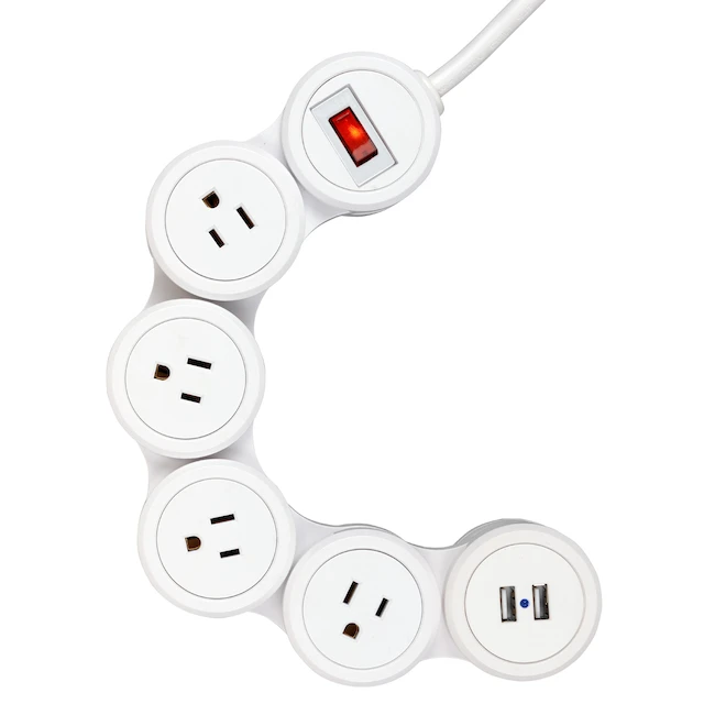 - Flexible surge protector power strip, 2 USB ports, 4 transformer outlets, 450 joules