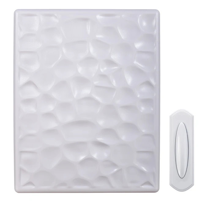 This Globe wireless doorbell chime kit is perfect for any type of home. The chime and the wireless push button are both white. Featuring a hammered finish, the chime runs on three “C” batteries (not included) and has a transmission range of up to 150-ft from the push button. It has six selectable tunes with adjustable volume. Battery included for the push button.