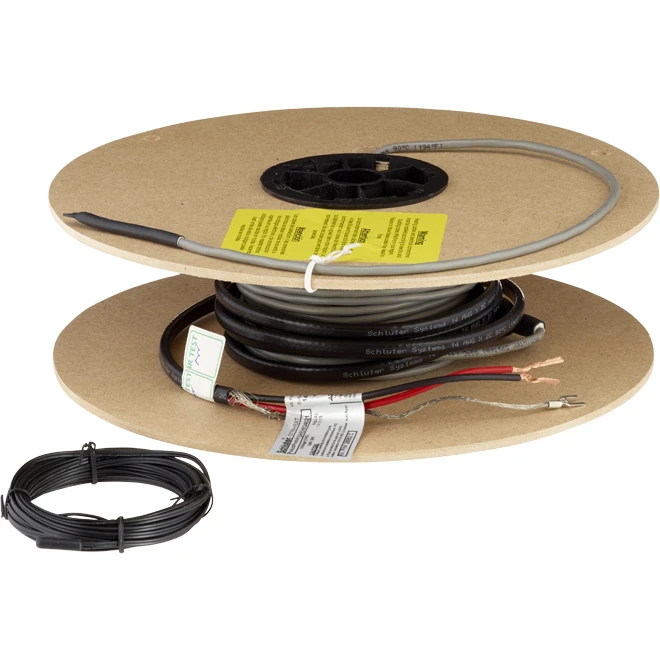 This twisted pair heating cable by Schluter Systems is designed specifically for use with the Ditra-Heat membrane for interior floor warming applications. The 240-Volt cable comes with one temperature sensor and can be installed without returning to the thermostat. Coverage area is 21.4 sq.ft. The cable can be placed on the floor wherever heat is desired. Self-levellers are not needed to encapsulate cables making installation faster and easier. 15-year limited warranty.