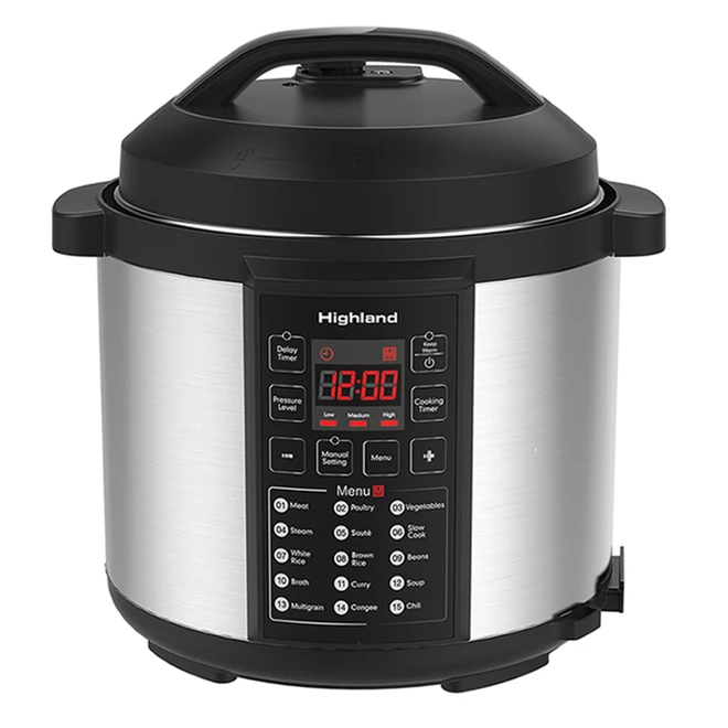 Highland 6 qt pressure cooker. Fully multi-functional with 9 preset menus. Pressure indicator easily displays the pressure status. 24-Hour programmable timer.