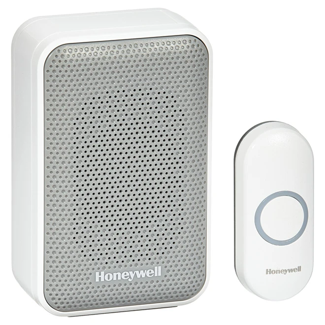Wireless LED Door Chime from Honeywell with a sound range up to 250′ (76 m). Comes with 4 tunes. High quality sound. Connect 2 transmitters simultaneously, such as push buttons and awareness devices (door contacts, motion sensors). Battery life up to 2 years. Easy to install, portable or wall mounted options (wall mounting kit included). ActiveLink robust signal. Requires 4 alkaline batteries, type AA (not included). 1-year warranty.
