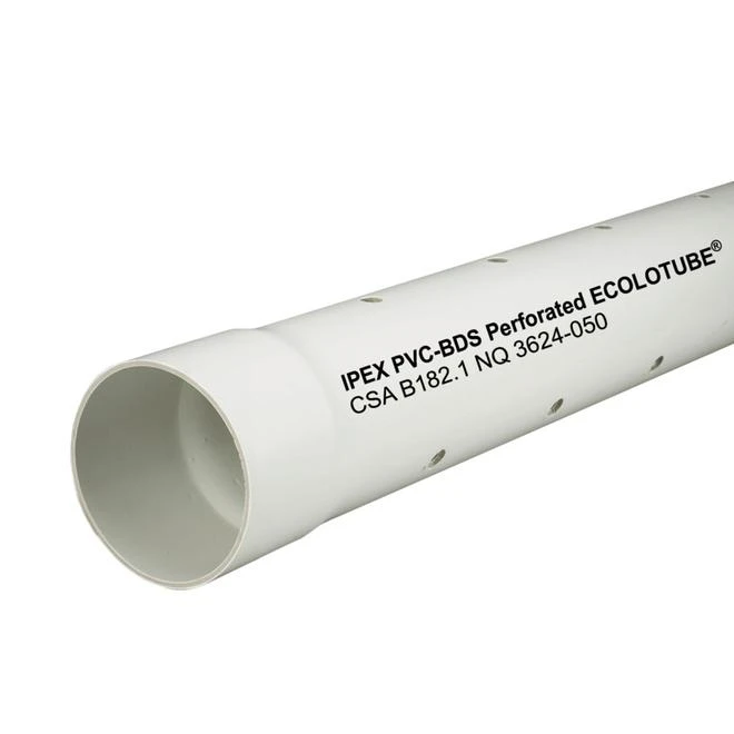 Use the Ipex perforated pipe drain for underground drainage. The pipe can work at temperatures from 32F up to 140F. The PVC pipe drain measures 3 in x dia and 10 in x L. It is approved by CSA safety listing and has BNQ certifications.