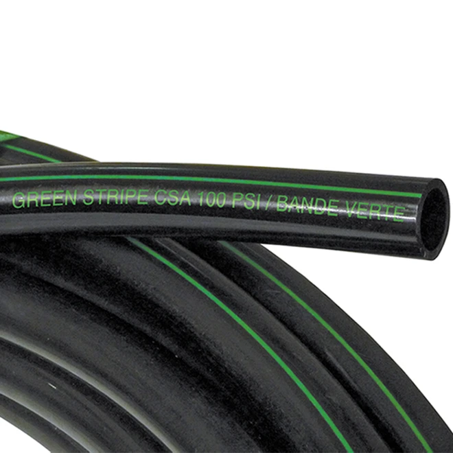 The IPEX drinking water green-striped black polyethylene pipe has a 1-in inside diameter and is suited for pressure applications up to 100 PSI. It is flexible, lightweight and requires only simple hand tools for installation. A unique formulation protects against UV rays in aboveground installations. Smooth interior walls eliminate calcium and other deposits build-up. Its flexibility allows for bending during installation. The pipe is available in 100-ft coils. Ideal for horticultural irrigation and lake or farm water distribution.