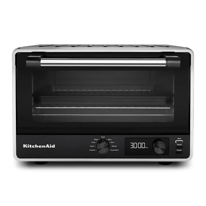 Get the same possibilities as a full-size oven, with quality results, in a convenient countertop size. KitchenAid brand brings full-size oven expertise to this digital countertop oven that fits more than you think. It includes a 9×13-inch baking pan and has 50% more capacity than a leading competitor, large enough to easily accommodate a 12-in pizza. In addition, this countertop oven features an easy-to-read digital display, 9 preset cooking functions plus frozen option for chef-like results, and a non-stick interior for quick and easy clean every time.
