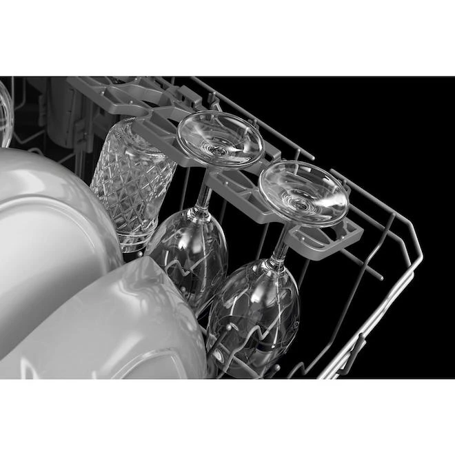 Because no two meals result in the same number of dishes, this dishwasher features the ProWash Cycle, which automatically adapts settings for different loads. An adjustable upper rack adds flexibility to fit tall items. Heated drying ensures dishes come out ready for your next creation. Quiet cleaning at 47 dB. Heat Dry Option activates a heating element to help dry dishes. Extended Heat Dry Option extends cycle time for best results. Stainless Steel Interior improves drying and resists odours. SatinGlide rails move smoothly for easy loading and unloading. Secure wine glasses or stack cups with the Fold-Down Shelf. Triple Filtration System circulates clean water to wash and rinse. Accessories not included.