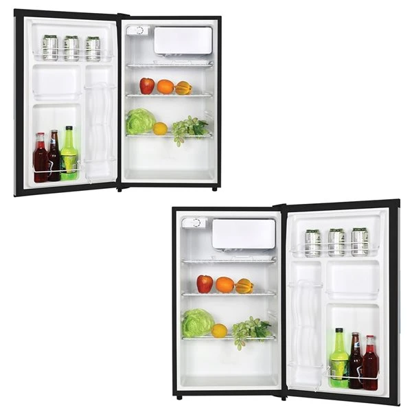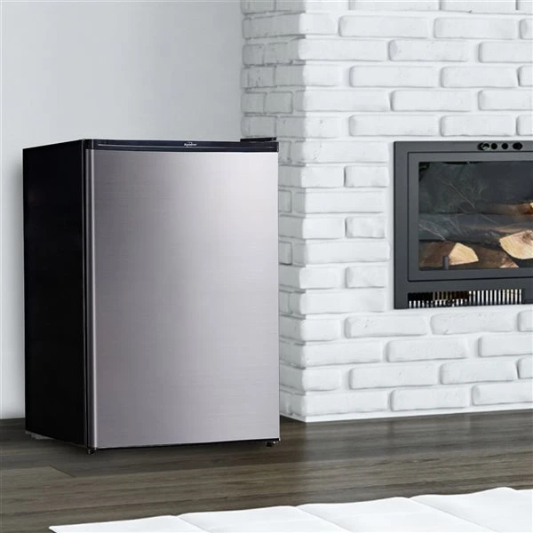 Compact 124 L/ 4.4 cu ft mini fridge with freezer compartment features a contemporary stainless steel exterior with black accents and plenty of door storage. Efficient, reliable compressor technology keeps contents at your desired temperature between 28°F (-2°C) and 50°F (10°C) so you can keep all your favourite snacks, soda, and beer right at hand in your den, office, dorm, home bar, or games room.