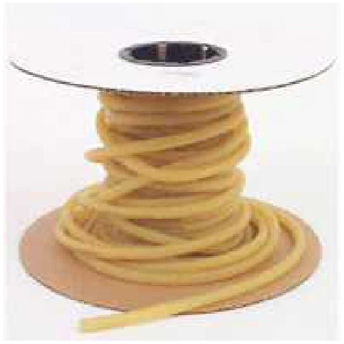 This 10′ latex hose has an inside diameter of 1/4″ and an outside diameter of 3/8″. Its amber walls are 1/16″ thick.