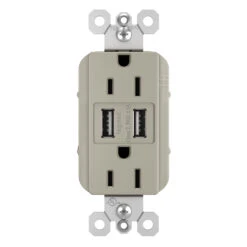 Tamper resistant receptacle with voltage rating of 125 VAC and current rating of 15 A. Has 3 wire grounding. Nema Configuration is 5-15 R and the color is nickel made up of plastic and steel. Fits in most any standard wall box and allows convenient charging without losing the use of standard electric outlets. This stylish in wall USB charger provides makes bulky plug ends unnecessary. Stylish nickel finish complements popular plumbing, lighting and hardware fixtures. Dual 15 A outlets provides full outlet utilization. 10-year limited warranty.