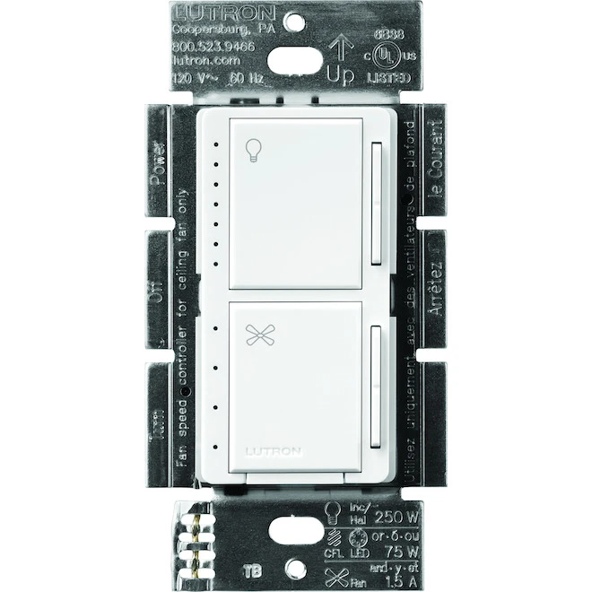 Maestro Fan Control and Light Dimmer For Dimmable LEDs provides the best dimming performance for LED bulbs. Programmable fade of the dimmer gradually turns lights on, allowing your eyes to adjust to the change in light, and gradually fade off, allowing time to exit a room before the lights turn off. Dimmer works with up to 75W of dimmable LEDs or CFLs or up to 250W of Incandescent or Halogen. Fan control works with up to 1.5A ceiling paddle fan. Fan control provides 4 quiet fan speeds for increased comfort. For use in single-pole applications. Includes (1) Fan/Light control; coordinating wallplate sold separately