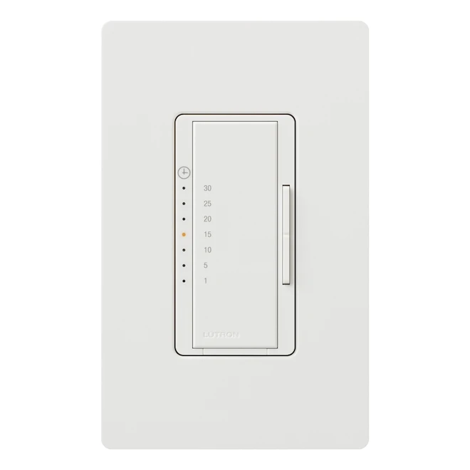 A simple and elegant switch designed to match your existing designer opening dimmer. Use the large tap switch to turn the timer on and off, and use the rocker on the side to set the timer to the desired time out option, anywhere from 1 to 30 minutes. Use with exhaust fan to reduce moisture, mold and mildew in bathrooms and kitchens. Saves energy by automatically turning on a fan or light. Softly lit orange LED ‘s indicate the time remaining before turn off. Maestro countdown timers coordinate with the entire Maestro collection of dimmers, switches and accessories. Works with a 3 amp fan or up to a 600 w/va (5amp) of incandescent/halogen or magnetic low-voltage lighting. No neutral wire required. Easy installation in as little as 15 minutes . Warranty 1 year